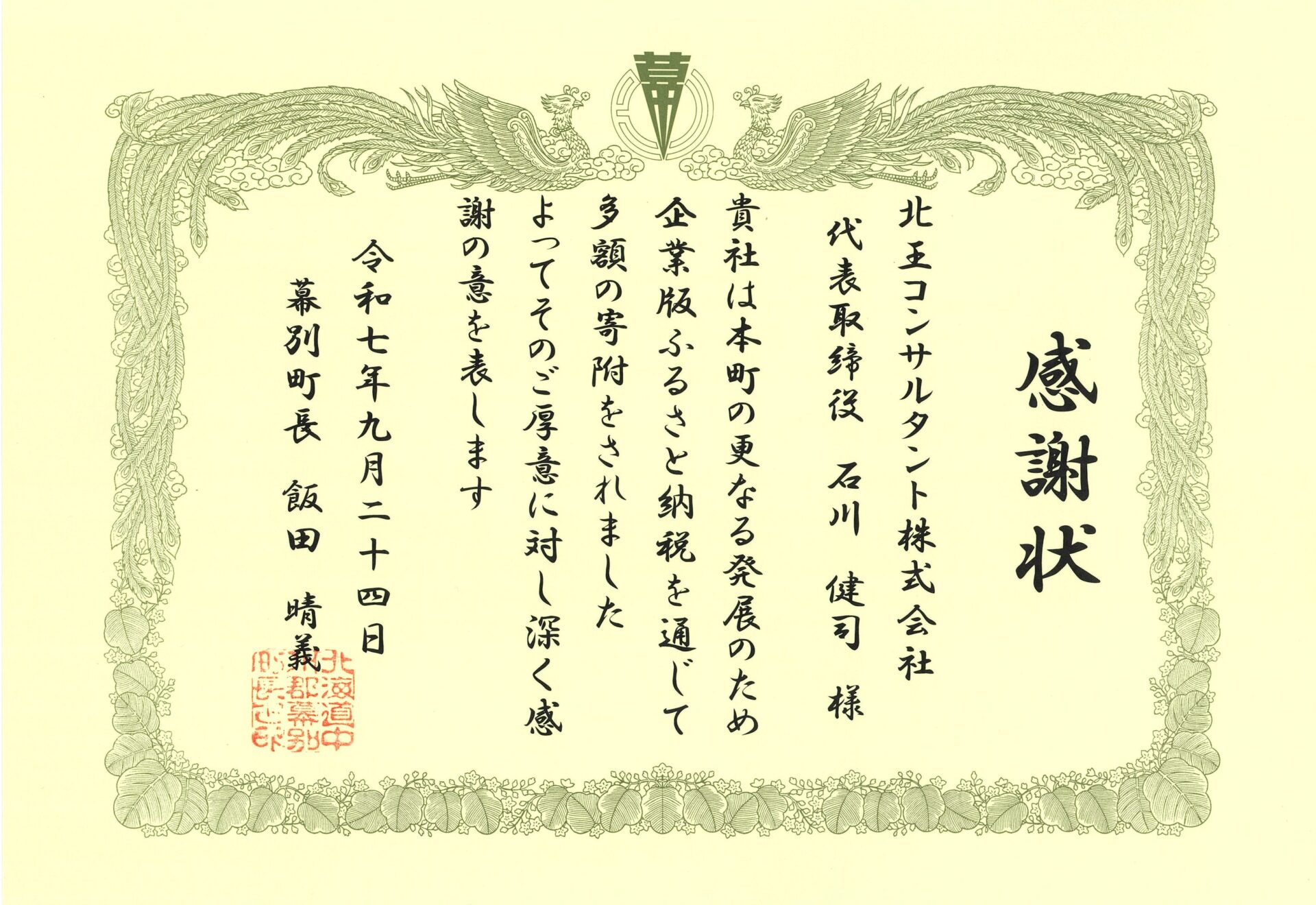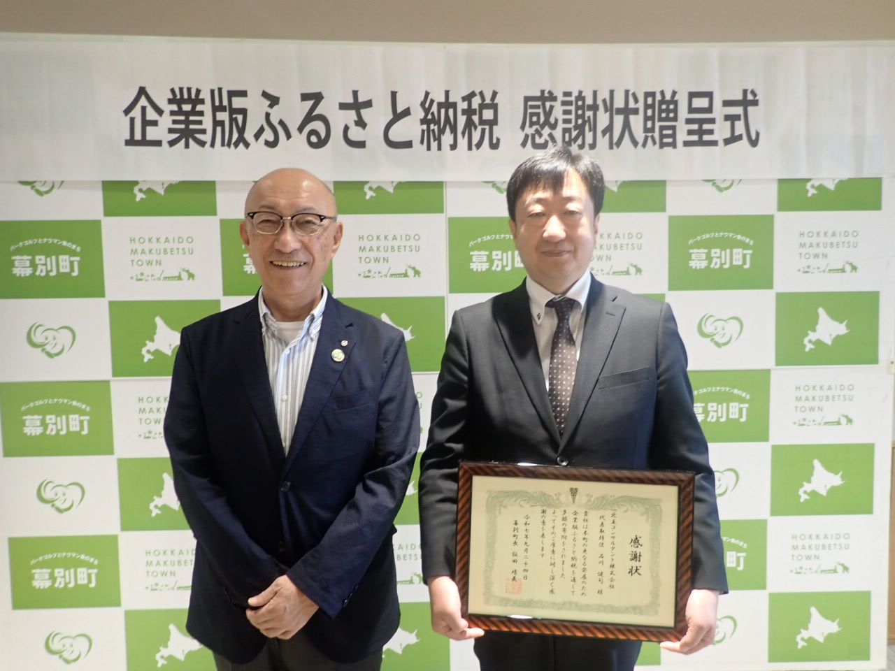 2025.10.03 お知らせ 幕別町より感謝状を授与されました 当社は、幕別町(町長:飯田晴義※写真左)における、「産業の振興と雇用の場をつくる事業」「十勝・幕別への人の流れをつくる事業」への支援として、「まち・ひと・しごと創生寄附金(企業版ふるさと納税)」を実施致しました。 令和7年9月24日(水)企業版ふるさと納税寄附金感謝状贈呈式が執り行われ感謝状を授与されました。 今後も、幕別町が推進する事業を応援していきます。