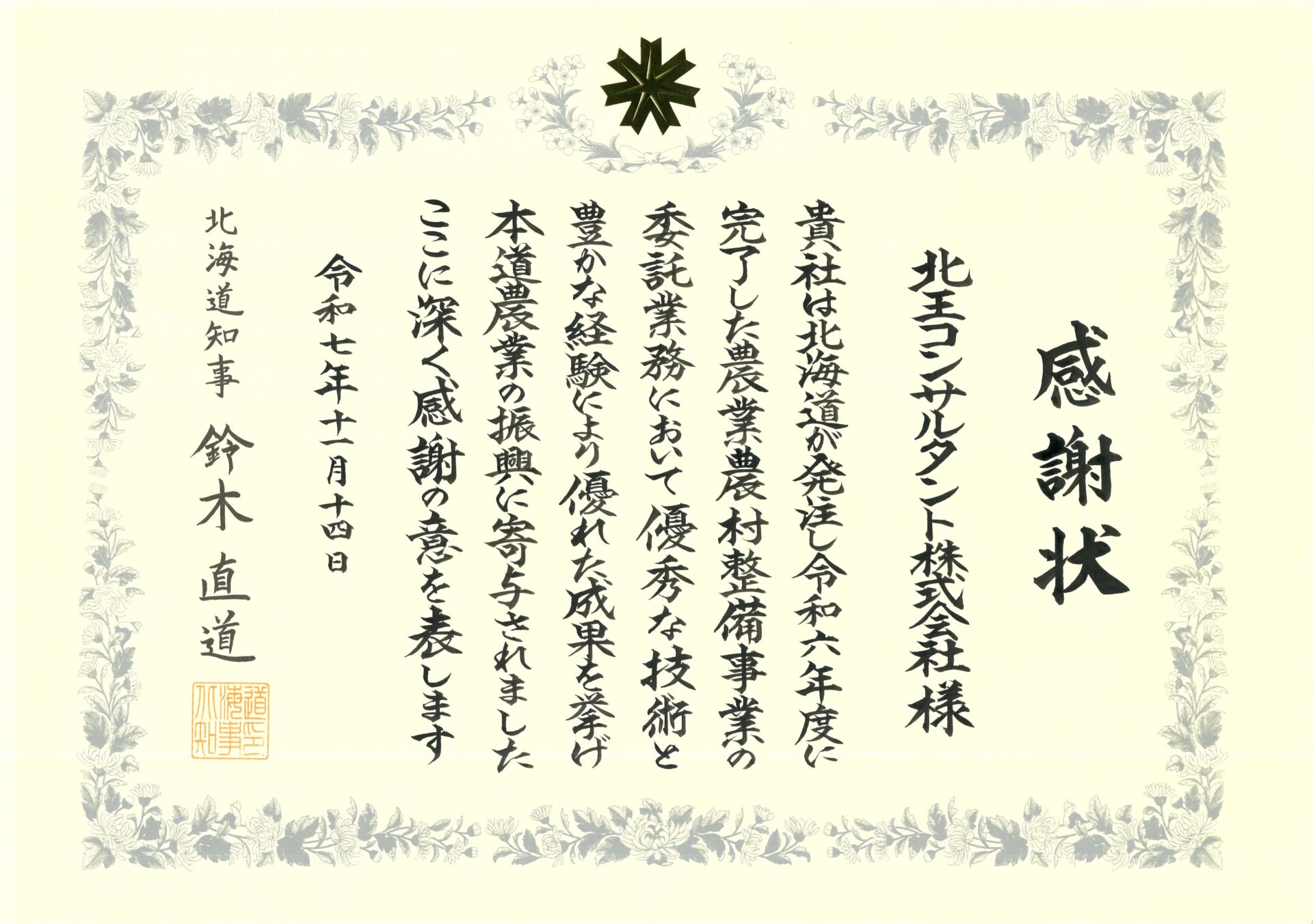 2025.12.08 お知らせ 令和7年度 北海道より感謝状を授与されました。 このたび、北海道より農業農村整備事業の委託業務において、その成果を評価いただき、感謝状を拝受いたしました。 弊社はこのたびの評価を励みとし、今後も培った技術力と経験を活かし、北海道の農業発展に貢献してまいります。引き続き、地域社会の持続的な発展に寄与すべく、より一層の技術向上と品質確保に努めてまいります。